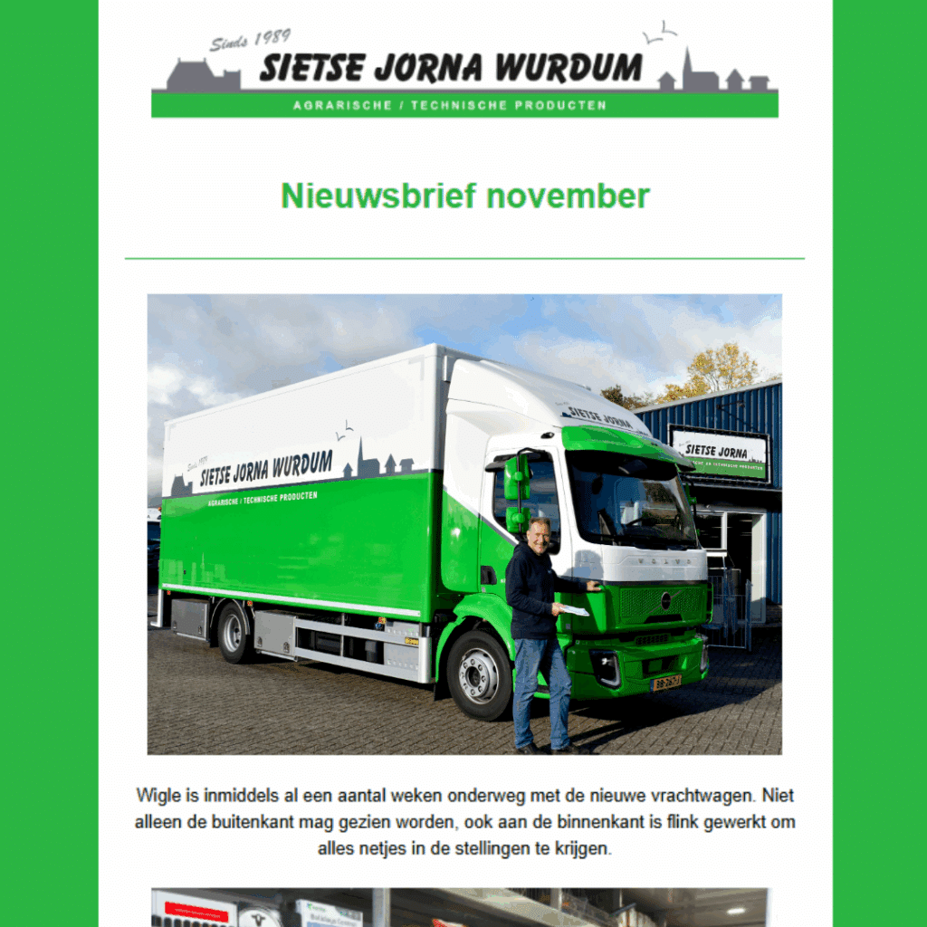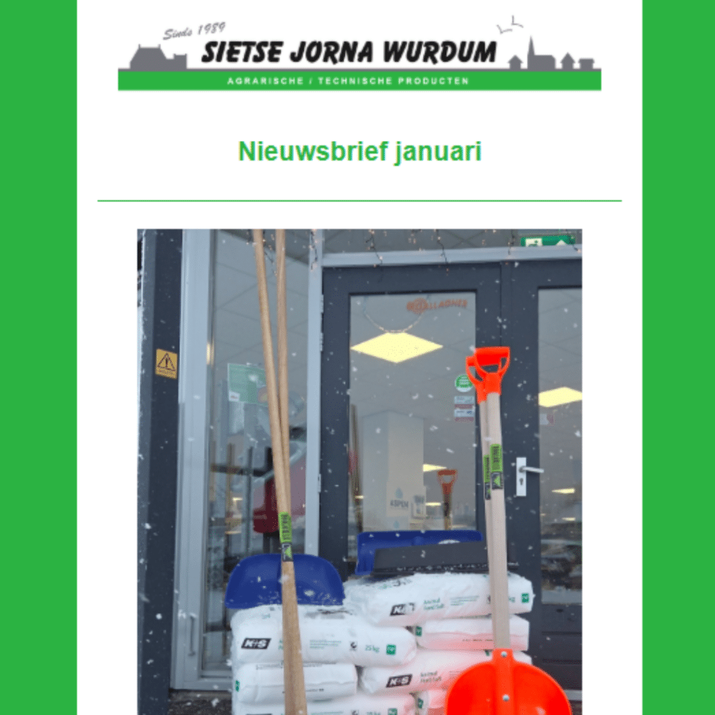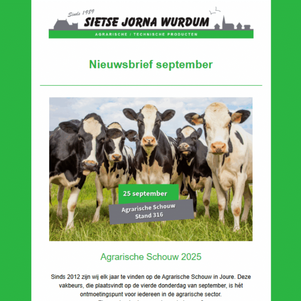 Nieuwsbrief Met de nieuwsbrief van Sietse Jorna brengen we graag artikelen onder de aandacht, zoals over het onderhoud van de veescheermachine en houden we je op de hoogte van nieuws en actualiteiten. Schrijf je in voor onze nieuwsbrief