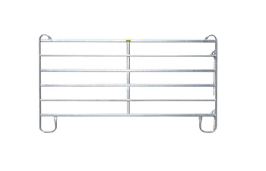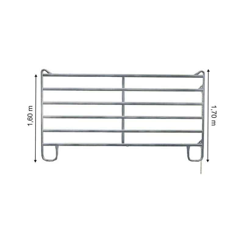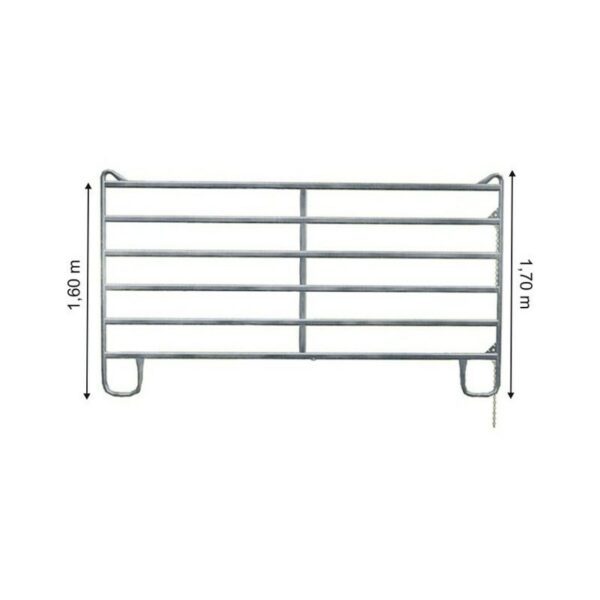 Patura Paneelhekwerk-6, 170cm hoog. Voor de bouw van mobiele behandelinstallaties, mobiele behandelboxen, cirkels en arena’s voor paarden. Gemaakt van warm gewalst speciale platovalen buis 50 x 30 x 1,5 mm voor de grootste stabiliteit met een klein gewicht. Kettingsluiting voor een snelle verbinding ook in oneffen terrein met een hanggleuf voor optimale kettingspanning. De poten van het landhek hebben een kuipvorm voor een goede stabiliteit en gemakkelijk wegglijden bij belasting. Hoog opgetrokken eindbuizen voorkomen, bij het opspringen van de dieren dat ze eraf glijden en dan tussen twee panelen vast komen.