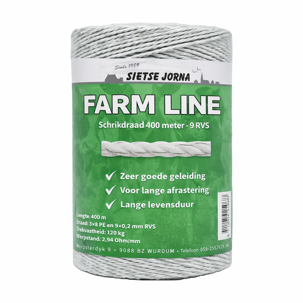 FARM LINE schrikdraad van Sietse Jorna is sterk schrikdraad voor iedere veehouder. Met een diameter van 3 mm en maar liefst negen roestvrijstalen geleiders (9 × 0,2 mm) staat dit schrikdraad garant voor uitstekende geleiding en lange levensduur. De hoge trekkracht van 120 kg biedt extra zekerheid. Dankzij het sterke PE-materiaal is het draad bestand tegen weer en wind en uitermate geschikt voor permanente afrasteringen in de agrarische sector. FARM LINE is een vervanger van de Tip Top schrikdraad.