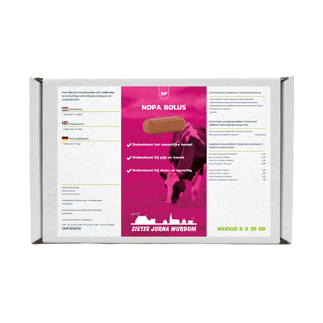 De Nopa bolus SJ; ter verlichting na het afkalven en tijdens klauw en uiergezondheidsproblemen. De Nopa Bolus is een aanvullend diervoeder (mineraalvoeder) van Sietse Jorna, dat ingezet kan worden bij een verminderde klauw- en uiergezondheid of na het afkalven. Bepaalde factoren kunnen stress veroorzaken bij koeien, zoals een zware geboorte. In dat soort situaties is het toedienen van de Nopa Bolus aan te raden. Door zijn unieke samenstelling zal de weerstand van de koe worden verhoogt. Het is een natuurlijke oplossing voor onmiddelijke verlichting voor de koe.