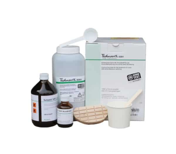 Technovit is een snel hardende kunststof welke ontstaat na het vermengen van poeder en vloeistof in bijgeleverde mengbekers. De massa goed doorroeren, na 3 minuten kunnen de blokjes aan de gezonde klauw. De uithardingstijd van de klauwlijm bedraagt ongeveer 5 minuten.