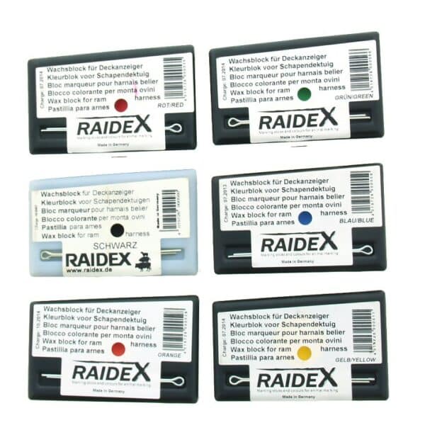 Met de Raidex dekblokken kunt u eenvoudig zien in welke periode uw ooi is gedekt. Geschikt voor zowel de lederen, nylon en luxe dektuigen. Deze Raidex ramblokken worden gemaakt van een speciale was, parafine olie en speciale pigmenten, die een hoge kwaliteit garanderen. Dankzij de speciale samenstelling zowel in de winter als zomer te gebruiken. Verkrijgbaar in de kleuren: rood, blauw, groen en geel.