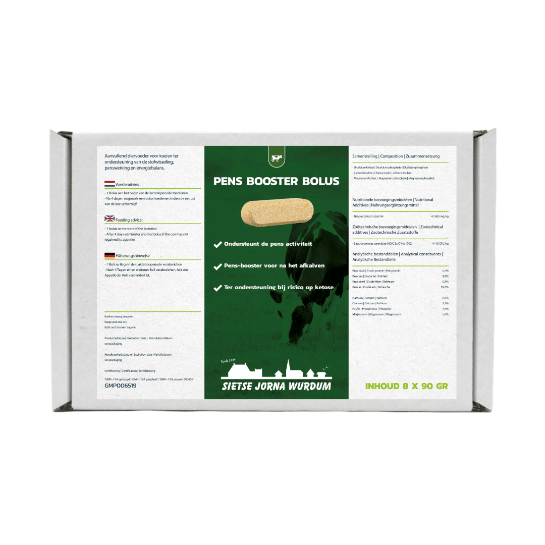 De Pens Booster bolus SJ is een aanvullend diervoeder van Sietse Jorna voor koeien ter ondersteuning van de stofwisseling, penswerking, transitieperiode en energiebalans.