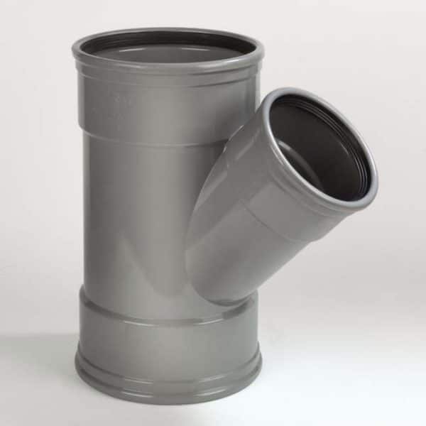 PVC T-stuk van 45° met drie rubber manchetringen en een diameter van 200 mm. Door de manchet kan er eenvoudig een dichte verbinding met een buis worden gemaakt. Het t-stuk heeft belastingsklasse SN4/SN8.