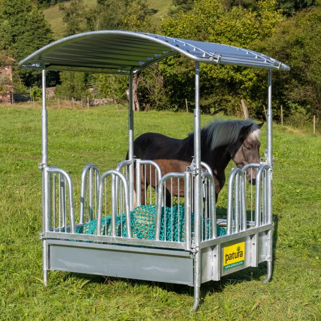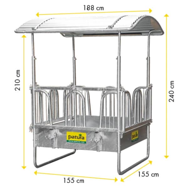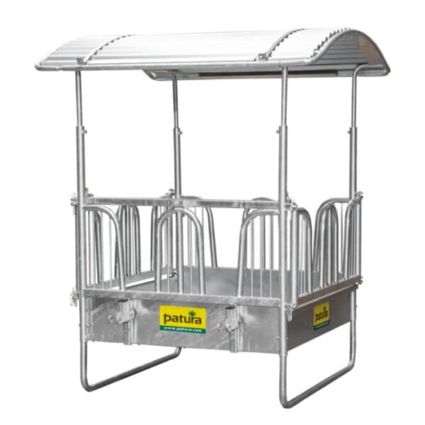 De Patura vierkante hooiruif met 8 voerplaatsen biedt een veilige en efficiënte oplossing voor het voeren van kleinere groepen dieren. Dankzij de veiligheidspalissadevoerroosters en de geïntegreerde dakrandbeschermbeugel wordt de veiligheid en het welzijn van het vee gewaarborgd. Extra schoren in het voerhek zorgen ervoor dat de hoeven niet vast kunnen komen te zitten, terwijl de in hoogte verstelbare sleden een flexibele voerhoogte mogelijk maken.