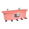De Peach Teats 5-speens kalverbar met een inhoud van 25 liter. De Open Feeder kalverbar kan door de verzonken ophangbeugels aan alle soorten hekken worden bevestigd. De kalveremmer is spuitgegoten voor sterkte en duurzaamheid, heeft een extra brede speenafstanden en de spenen kunnen worden losgeschroefd voor eenvoudige reiniging. Het is een open voerbak, zodat het eerste kalf dat klaar is met voeren de andere kalveren niet van de speen duwt.