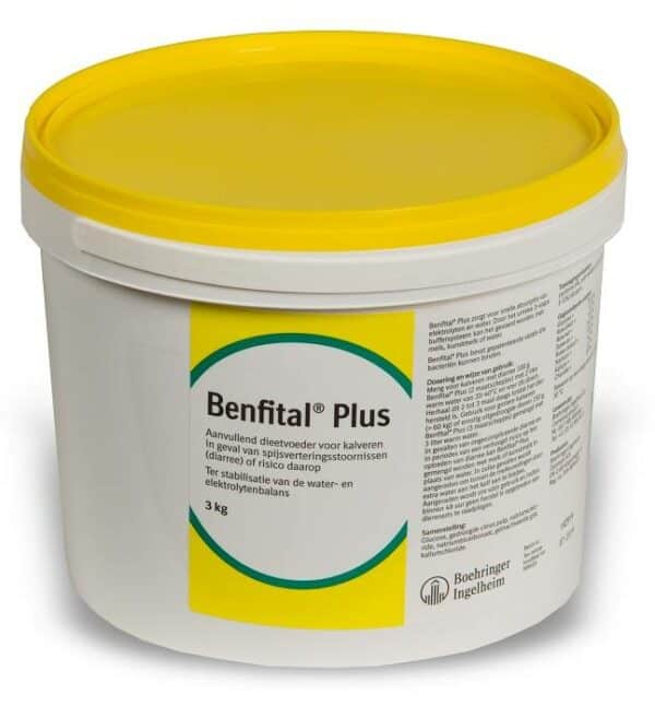Dosering en wijze van gebruik: Meng voor kalveren met diarree 100 g Benfital®Plus (2 maatschepjes) met 2 liter lauwwarm water (35-40°C) en voer dit direct.