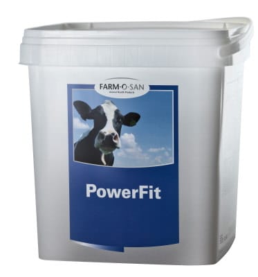 Farm-O-San PowerFit is een aanvullend dieetvoeder ter stabilisatie van de water- en elektrolytenbalans. Inzetbaar bij kalveren die veel en snel vocht verliezen als gevolg van hoge temperaturen en stress-situaties. Hierdoor gaan lichaamszouten verloren en loopt de conditie van het kalf snel terug. Het gevolg is dat het kalf niet meer wil drinken, minder goed groeit en zelfs dood kan gaan.