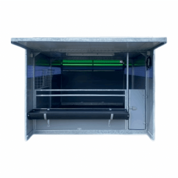 Wordt compleet geleverd met hooiruif, verlichting, voerbak en trog.