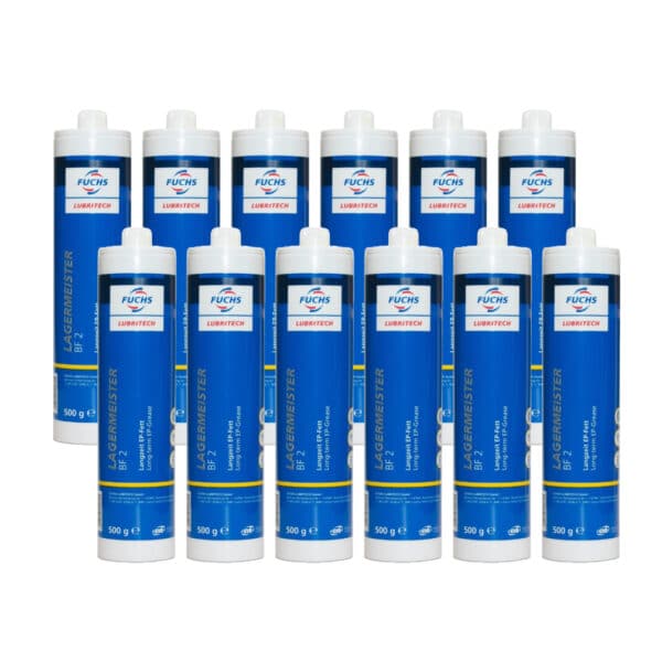 Fuchs Lagermeister BF2 vetpatroon met schroefdraad. Het Lagermeister BF2 vet heeft een lange levensduur en is gebaseerd op paraffinische minerale olie. Het vet kan gebruikt worden als multifunctionele vet voor smering. Het Fuchs vet is verouderingsbestendig, waterbestendig, beschermt tegen corrosie en is makkelijk verpompbaar in centrale smeersystemen. Fuchs Lagermeister BF 2 smeervet wordt veel gebruikt in de agrarische sector, industrie, bouw en transport.