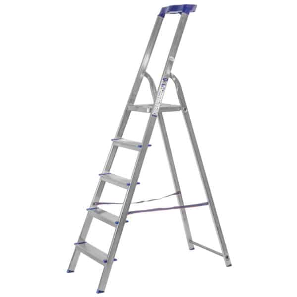 Deze lichtgewicht huishoudtrap BASIC-line van Maxall heeft 5 treden inclusief een een bordestap, wat zorgt voor extra stabiliteit en comfort tijdens gebruik. Het bordes is ca. 26×26 cm groot, ideaal voor het veilig staan tijdens werkzaamheden. De gereedschapshouder is uitgerust met meerdere gereedschapsgaten, een groot vak voor kleine onderdelen, en een emmerhaak, zodat je al jouw benodigdheden binnen handbereik hebt.