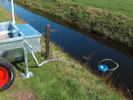 Laat de Rule 2000 oppervlakte pomp losjes in de drijfband hangen, hierdoor kan de pomp goed koelen in het water. Bij de Poortman Solar 1500 oppervlaktepomp wordt via de aanzuigkamer water om de motor heen gepompt. Deze pomp hoeft dus niet diep in het water te liggen voor koeling. Monteer de pomp met 3 lange UV-bestendige trekstrips uit het trekstripset.