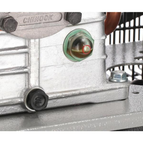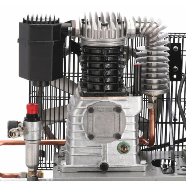 Met het reduceerventiel, te herkennen aan de rode draaiknop op de olie/waterafscheider, stel je snel en eenvoudig de gewenste werkdruk in die je kunt aflezen op de manometer. Bovendien zorgt het oliegesmeerde systeem voor een lange levensduur en betrouwbare werking van de compressor.