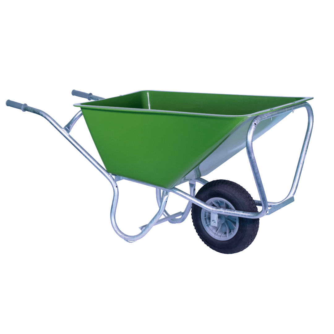 Het frame van de kruiwagen bestaat uit 30mm gegalvaniseerde buis, uit één geheel. Het wiel heeft een afmeting van 400×8 4 Ply en bestaat uit een buitenband en binnenband, uitgevoerd met kogellagering.