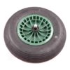 Kruiwagenwiel 400 x 100 mm met as, met kunststof velg en 2ply band. De velg is gemaakt van polypropyleen kunststof, kleur groen. Geen roestvorming en geen vastroestend lager. De band heeft een tubeless buitenband 16 x 4″ – 2 ply (400×100 mm). As met binnenschroefdraad aan de uiteinden met rollenlager, stofdoppen tegen het indringen van vuil en 2 wielbouten.