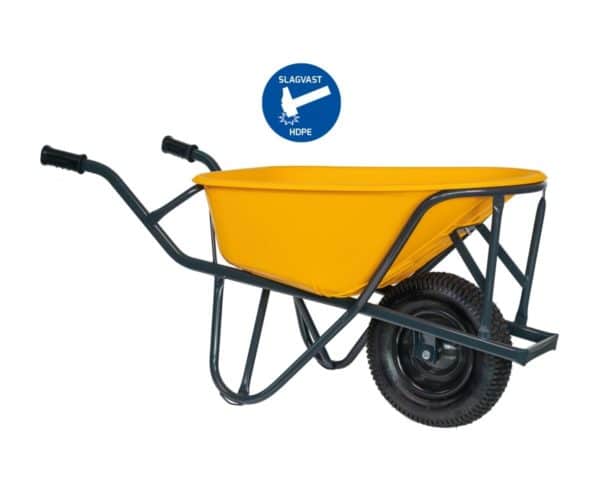 Stratenmakers kruiwagen HDPE met een 90 liter kunststof bak, in de kleur geel. Het frame van de gele bouwkruiwagen is gemaakt van gecoate ovalen buis. Daarnaast beschikt de kruiwagen over slijtsloffen en foam handvatten, deze handvatten liggen fijn in de hand wat zorgt voor extra comfort tijdens het gebruik. Door de rechte kopbeugel is het mogelijk om de kruiwagen rechtop te zetten. De bak heeft een inhoud van 100 liter en is gemaakt van HDPE kunststof, dit zorgt voor een zeer lange levensduur. Het wiel van de kruiwagen heeft een metalen velg en is voorzien van naaldlagers en een binnenband.