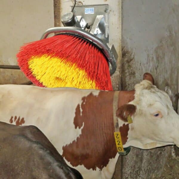 De Suevia Easycleaner koeborstel is een schuin geplaatste grote roterende veeborstel. De Suevia koeborstel is geschikt voor kleinere ruimtes en zorgt voor meer comfort en optimale hygiëne in de stal. De borstel stimuleert een goede bloedsomloop en reinigt en verzorgt de huid en vacht van de koe. Het grote borsteloppervlakte en de roterende borstelbeweging zorgen voor een gelijkmatige massage van de kop en de rug, als ook grote delen van de flanken en biedt de dieren een optimaal koecomfort.