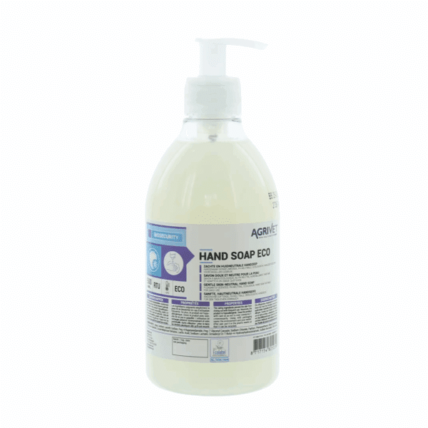 Agrivet Handzeep Eco 500m met pompje, is een mild geparfumeerde ecologische handzeep met extra huidverzorging. Hierdoor geschikt voor dagelijks gebruik en is pH huidneutraal. De verzorgende eigenschappen voorkomen uitdroging van de huid bij frequent gebruik. Toe te passen in navulbare zeepautomaten en zeepflacons. Dit product is gecertificeerd met het Europees Ecolabel