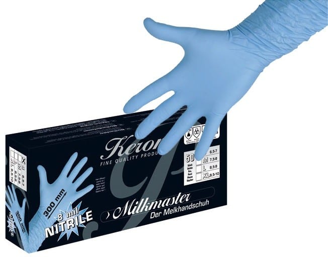 Melkhandschoen Keron Milkmaster Nitril met extra lange schacht (circa 30cm) voor comfortabele bescherming. De melkershandchoenen zijn blauw van kleur en poedervrij. Wanddikte 0.2 mm (ca. 8 mil), voor hygiënisch melken. Geschikt voor zowel de linker- als de rechterhand. Vervaardigd uit nitril voor hoge gevoeligheid.