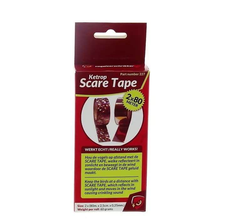 Scare Tape is ontworpen om op een natuurlijke manier vogels af te schrikken. Het reflecterende materiaal en het geluid dat wordt geproduceerd door de tape in de wind, creëren een verontrustende omgeving voor vogels, waardoor ze worden afgeschrikt en ze gewassen met rust worden gelaten.