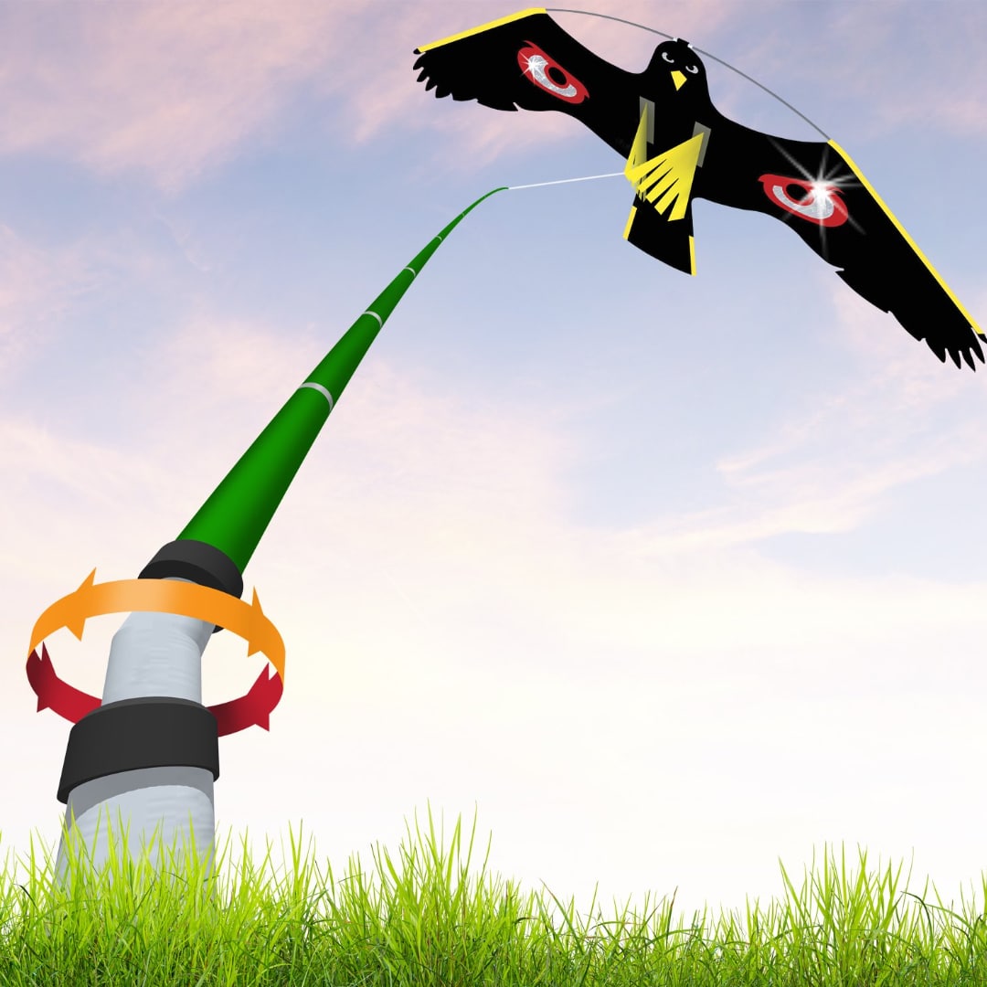 De Vogelverschrikker Twin (Terror Kite en Terror Hawk) 7m. is een stille vogelverschrikker die beweegt, klimt en duikt als een echte valk. Deze set bevat de Terror Kite en de Terror Hawk, twee realistische roofvogelvliegers die instinctieve angst opwekken bij ongewenste vogels en andere dieren. Deze vliegers starten zelfs bij weinig wind en maakt gebruik van het instinctieve vluchtgedrag van dieren. Met een standaard glasvezel paal van 7 meter en een vlieghoogte tot 12 meter, is deze vogelverschrikker ideaal voor het afschrikken van ganzen, kraaiachtigen, spreeuwen, duiven, konijnen, hazen, reewild, merels en zangvogeltjes. Perfect voor oppervlakten tot ongeveer 1 hectare. Bestel nu en bescherm jouw landbouwgrond effectief tegen ongewenste vogels!