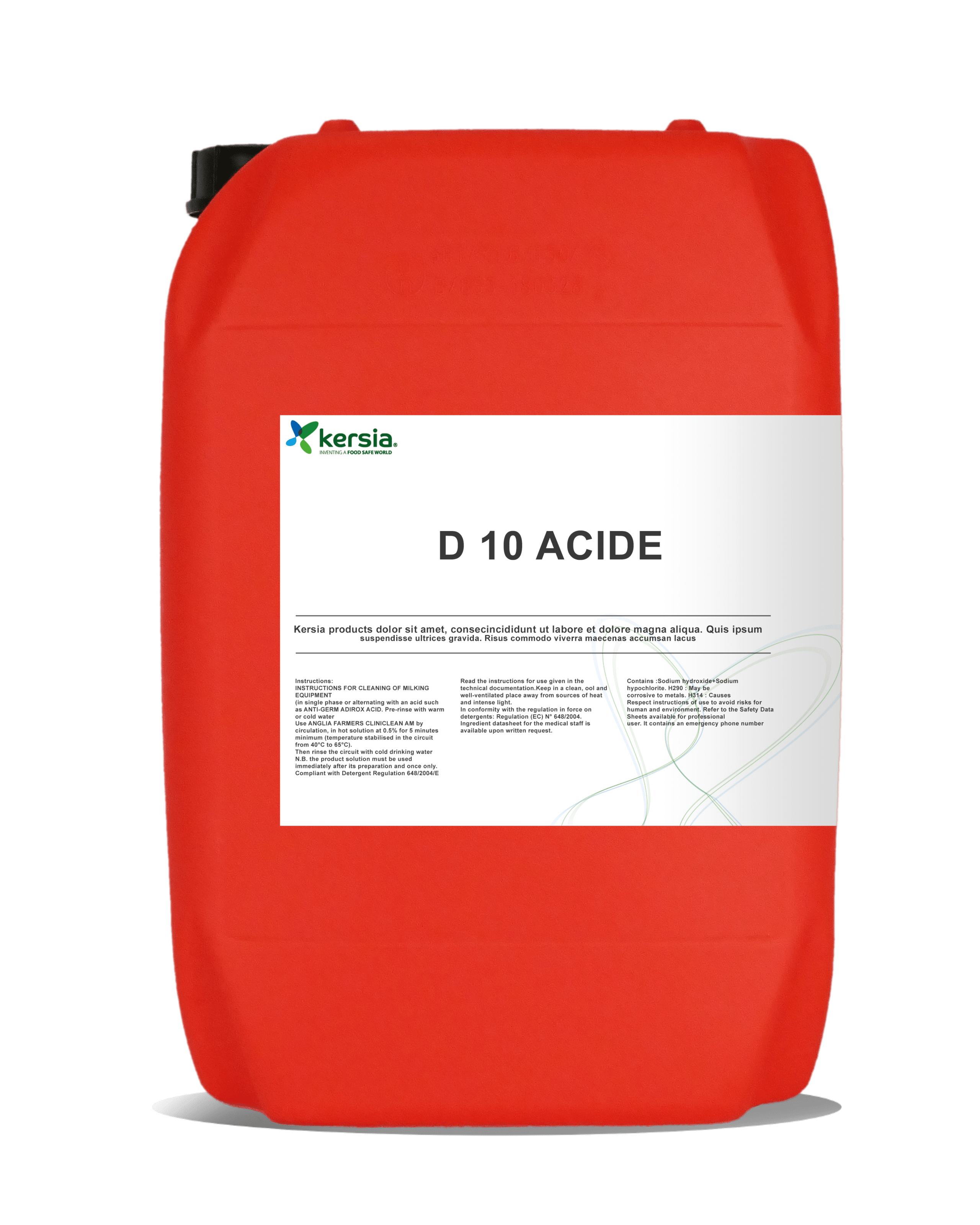 Kersia D-10 Acide is een geconcentreerde zure reiniger voor de melkinstallatie op basis van salpeterzuur, aangevuld met fosfor- en zwavelzuur. Hierdoor zorgt de formule voor een goede verwijdering van mineraalafzettingen in de leidingen.