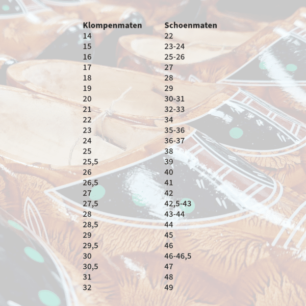 Bij het passen van een klomp schuift men de voet zo ver mogelijk naar voren. Als er nog een vinger achter de hak kan, weet je dat je de juiste maat hebt.